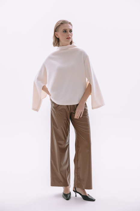 Брюки свободного кроя из экокожи на байке, верхний срез представлен широкой декоративной резинкой. Длина брюк 101 см
