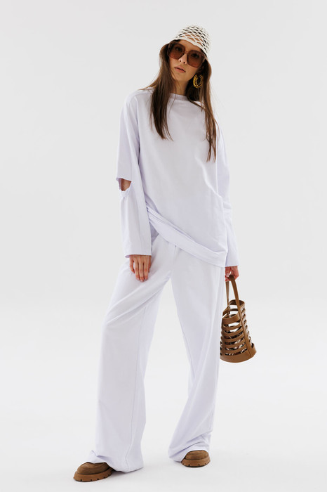Брюки свободного кроя, верхний срез представлен широкой резинкой, с карманами.