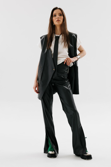 Брюки клёш немного зауженные к линии колена и прямые от линии колена. На передних и задних половинках  талиевые вытачки. Пояс притачной. Снизу в боковых швах расположены высокие шлицы.