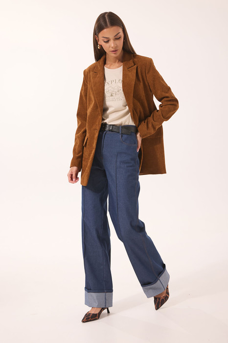 Брюки выполнены из джинсовой ткани, расширены к низу. На передней и задней половинках отстрочены стрелки до контрольных точек. На задней половинке – кокетка и накладные карманы. На передней половинке – боковой карман, с правой стороны – маленький накладной кармашек. Верхний срез обработан поясом со шлевками. Низ брюк с широкой манжетой на изнаночную сторону джинса.