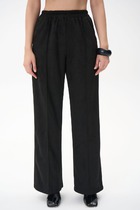Детали: высокая посадка, передние половины брюк с двумя складками, эластичный пояс-резинка, боковые карманы, без застежки.