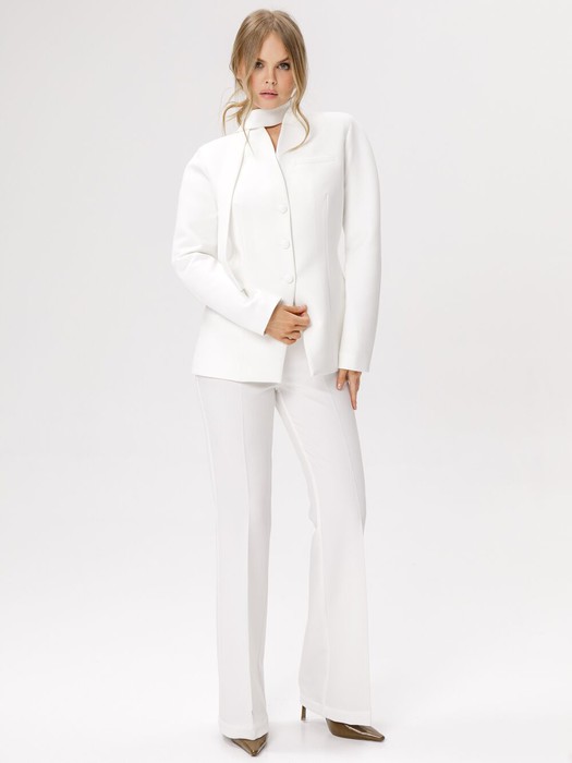 Детали: притачной пояс со шлевками, передние половины с заутюженными стрелками, застежка на молнию и потайные крючки, боковые карманы. Задние части брюк с вытачками и заутюженными стрелками. Пояс брюк без резинки.