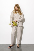 Детали: брюки на притачном поясе со шлевками, передние половины с небольшими мягкими складками и заутюженными стрелками, застежка на молнию и пуговицу, боковые карманы.
