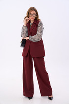 Модель свободного кроя, к низу чуть заужена, на эластичном поясе, со шлёвками. В кулису на поясе вставлен шнурок с наконечниками. Спереди прорезные карманы с листочкой. Сзади накладные карманы. По низу брюк застрочены вытачки. Ширина по низу регулируется резинкой и фиксаторами, создавая разный силуэт.