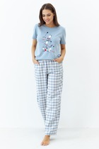 Брюки – из гладкокрашеного трикотажного полотна "кулирка с лайкрой"длинные, классического кроя, на притачном поясе с эластичной тесьмой внутри и карманами в боковых швах. Передние половины брюк застрочены по центральным линиям. По центру пояса настрочен декоративный элемент