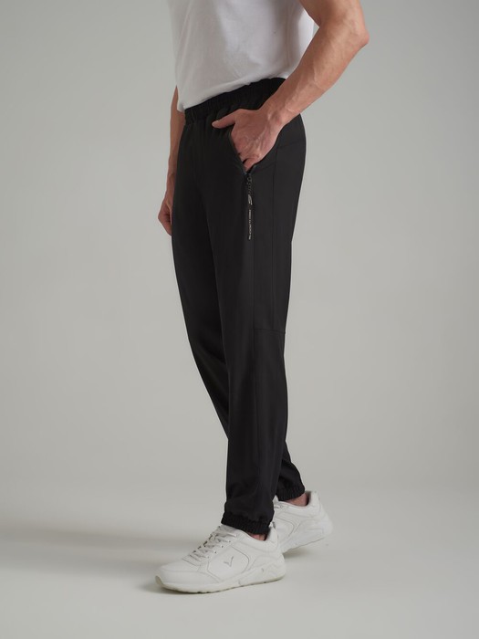 Мужские брюки из облегченной плащевой ткани без подкладки. На передних половинках выполнены прорезные карманы с открытой молнией. Пояс по талии регулируется шнуром. По боковым швам отстрочка. На левой половинке под карманом настрочен шеврон с фирменным логотипом.