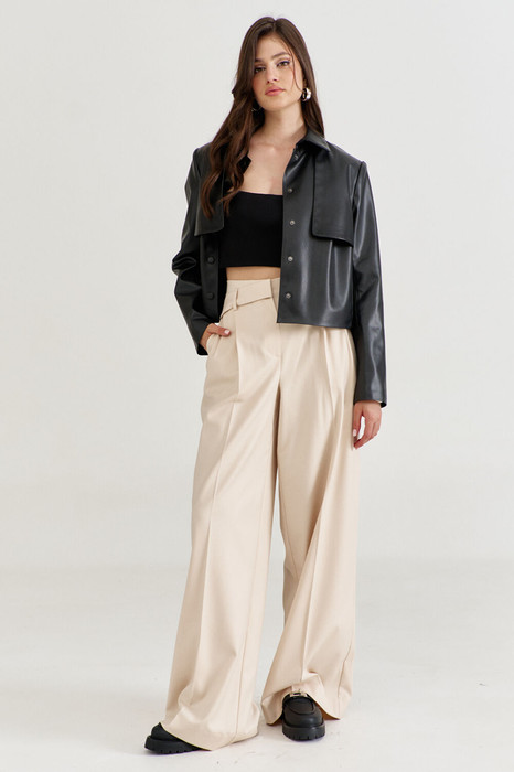 Брюки женские, длинные. По задним половинам талиевые вытачки и цельнокроеный пояс. По передним половинам односторонние складки частично застроченные, карманы фигурной формы. По задним и передним половинам заутюжены стрелки. В среднем шве обработана застежка на тесьму-«молнию». Верхний срез передних половин обработан притачным поясом. По спинке, между вытачками вставлена резинка.