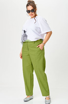 Брюки женские из текстильной ткани свободного силуэта с высокой посадкой!!! ("брюки-бананы"). По переду расположены карманы. На задней половинке отрезная кокетка и накладные карманы. Пояс притачной со шлевками.  По спинке вставлена резинка. Застежка-гульфик на молнию и пуговицу.