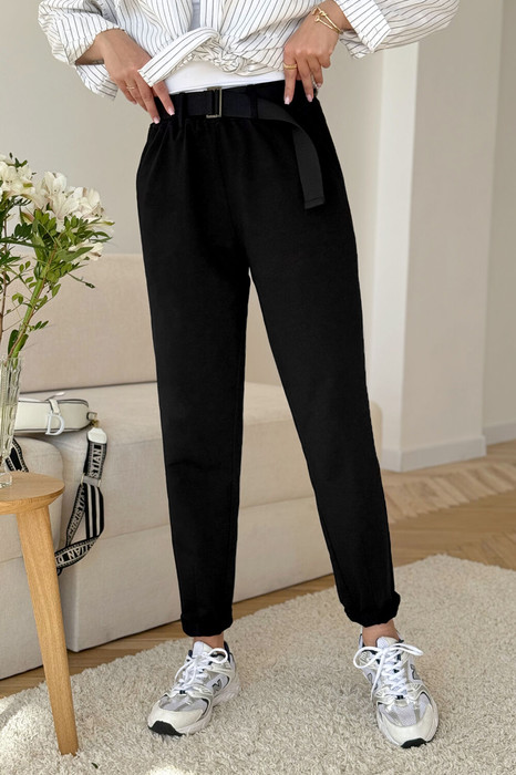 Брюки женские из трикотажной хлопковой ткани (двунитка), слегка заужены к низу. В боковых швах расположены карманы. По низу передних половинок есть защип. Задняя половинка брюк с отрезной кокеткой и накладными карманами. Вверх брюк обработан поясом с резинкой (без молнии). ПОЯС ВХОДИТ В КОМПЛЕКТ.