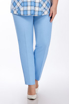 Брюки женские спортивного стиля из эластичного хлопкового полотна, прямого от бедра кроя. По передним половинкам брюк расположены фигурные карманы. По передним и задним половинкам отсрочены канты. Пояс брюк притачной с эластичной тесьмой-резинкой, в передней части пояса вставлен декоративный шнурок с металлическими наконечниками.