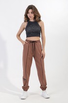 Брюки женские из эластичного трикотажного полотна, прямого от бедра кроя. По передним половинкам брюк расположены фигурные карманы. По передним и задним половинкам заутюжнены канты. Пояс брюк притачной, с эластичной тесьмой-резинкой.
