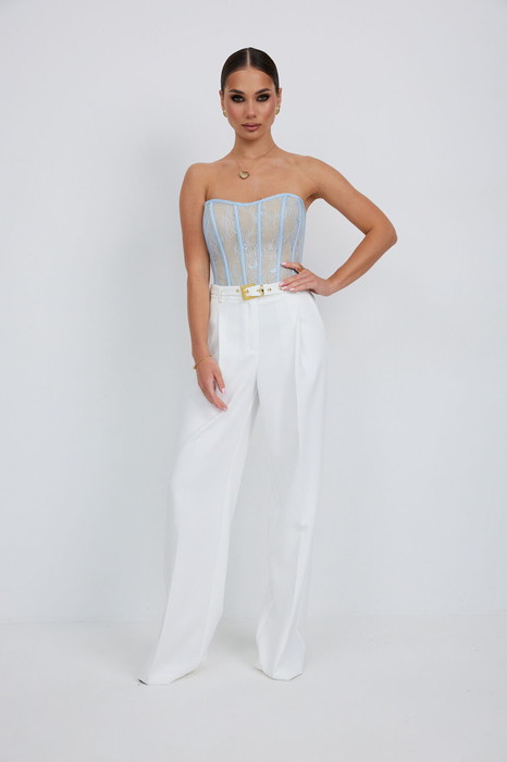 Брюки прямые из костюмной ткани. Верх на поясе со шлевками. Ширинка на молнии и удлиненный пояс со скрытой застежкой на пуговицу и крючок. Складки спереди, диагональные боковые карманы и задние прорезные листочки.