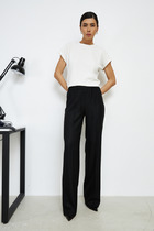 Брюки прямые из костюмной ткани. Верх на поясе со шлевками. Ширинка на молнии и удлиненный пояс со скрытой застежкой на пуговицу и крючок. Складки спереди, диагональные боковые карманы и задние прорезные листочки.