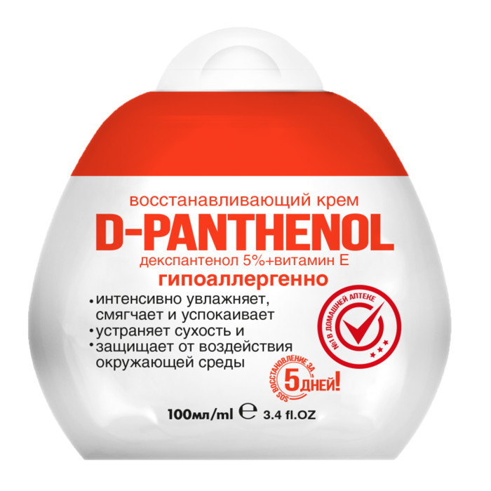 Восстанавливающий крем Д-ПАНТЕНОЛ + ВИТАМИН Е оказывает заживляющее и успокаивающее действие на кожу при ссадинах, трещинах, солнечных ожогах и раздражении.