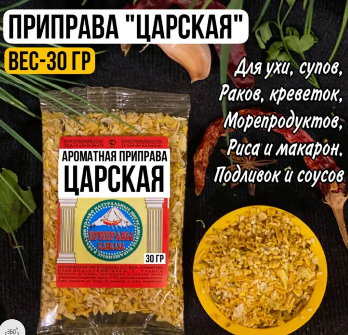 Название этой прекрасной смеси говорит само за себя! Любые блюда, которые вы будете готовить с добавлением этой приправы способны стать настоящим кулинарным шедевром. Грамотно подобранный состав способен обогатить вкус самого простого супа, добавить пикантную нотку рыбе или морепродуктам, а так же многим вторым блюдам с подливкой. Все, кто хоть раз попробовал нашу «ЦАРСКУЮ» приправу остаются её поклонниками навсегда и регулярно включают её в свои заказы.