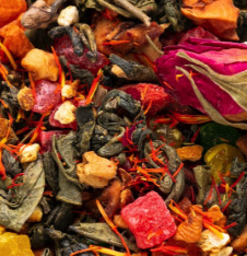 Зеленый Ганпаудер обогащен ароматными цукатами манго, папайи и ананаса, фруктовой цедрой апельсина, кусочками сушеного яблока, лепестками сафлора, бутонами роз и ягодами годжи.