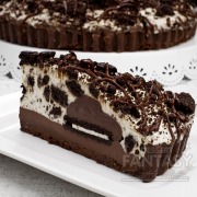 Чизкейк с кусочками печенья «Орео», с белым и молочным шоколадом, украшенный кусочками печенья и темным шоколадом.