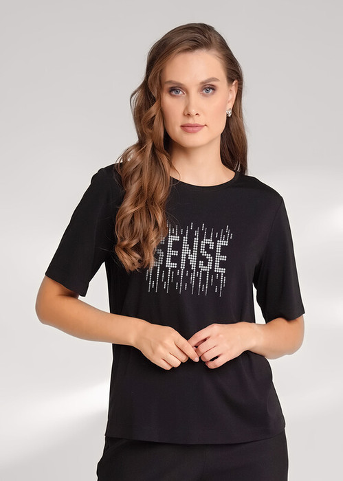 Футболка прямого кроя из поливискозного трикотажного полотна интерлок. Короткий втачной рукав. Округлая горловина с обтачкой. Спереди термопайетки.