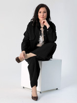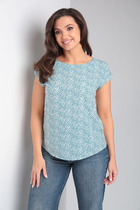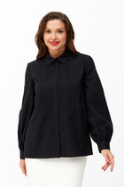 Блузка из вискозного трикотажного полотна джерси, свободного кроя. Втачной короткий рукав. Отложной воротник со стойкой, спереди цельнокроеная планка на пуговицах. Боковые разрезы, нашивка металл.