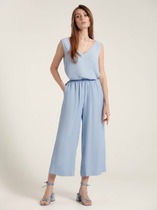Брюки прямые из плотного трикотажного полотна. По талии притачной пояс с застежкой на пуговицу, по спинке пояс на резинке. По переду карманы в листочку с декоративной тесьмой.