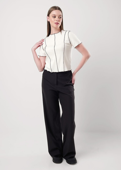 Брюки широкие из трикотажного полотна. Притачной пояс со шлевками, гульфиком и застежкой на молнию и потайную пуговицу. Боковые карманы с отрезным бочком. По спинке вытачки.