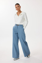 Брюки прямые с ц/в поясом спереди и притачным поясом по спинке. 5 шлевок. Спереди карманы, гульфик, застежка на молнию и 2 пуговицы. По спинке вытачки, листочки. Заутюженные стрелки спереди и на спинке.