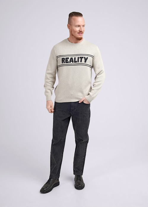Мужской вязаный джемпер с круглым вырезом горловины и длинным рукавом. Джемпер из смесовой пряжи с хлопком, модель дополнена вывязанным текстовым рисунком. Изделие подойдет к любому низу.