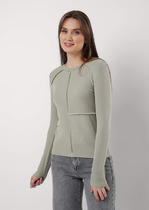 Вязаный джемпер умеренного обьема из акриловой пряжи с добавлением полиэстера, ластичного переплетения с контрастными горизонтальными узкими полосками. По горловине двойная бейка. По низу рукавов и изделия манжеты.