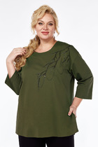 Вязаный джемпер прямого силуэта из вискозной пряжи с добавлением нейлона, переплетение гладь. Короткий спущенный рукав. Округлая горловина с бейкой. По горловине и низу изделия сдвоенная гладь, по рукаву ластичное переплетение. Спереди нашивка металл.