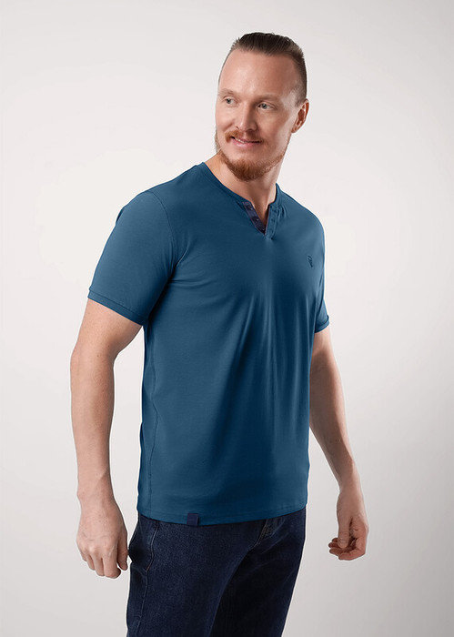 Футболка из дышащего хлопкового полотна с удобной планкой на пуговицы. На футболке небольшая вышивка. Интересное звучание модели придаёт необычная обработка боковых швов. Данную модель можно дополнить брюками или джинсами.
