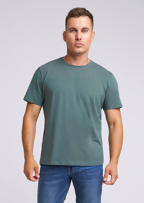 Базовая однотонная футболка стандартного объема с круглой горловиной, втачным рукавом из хлопкового полотна с добавлением эластана. Является неотъемлемой частью мужского гардероба.