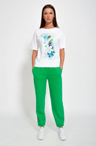 Джемпер оверсайз из эластичного трикотажного полотна. Короткий втачной рукав. Круглый вырез горловины. По бокам разрезы. По переду принт вспенка.