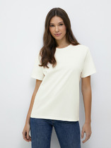 Джемпер умеренного объема из хлопкового трикотажного полотна. Втачной короткий рукав. Округлая горловина с окантовкой.