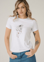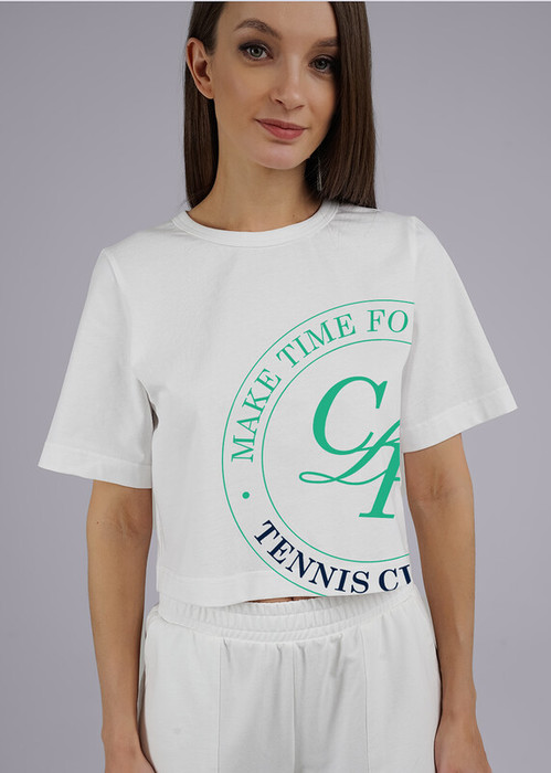 Футболка из трикотажного полотна укороченная прямого кроя, короткий втачной рукав. Округлая горловина с окантовкой из рибаны. На детали переда принт.