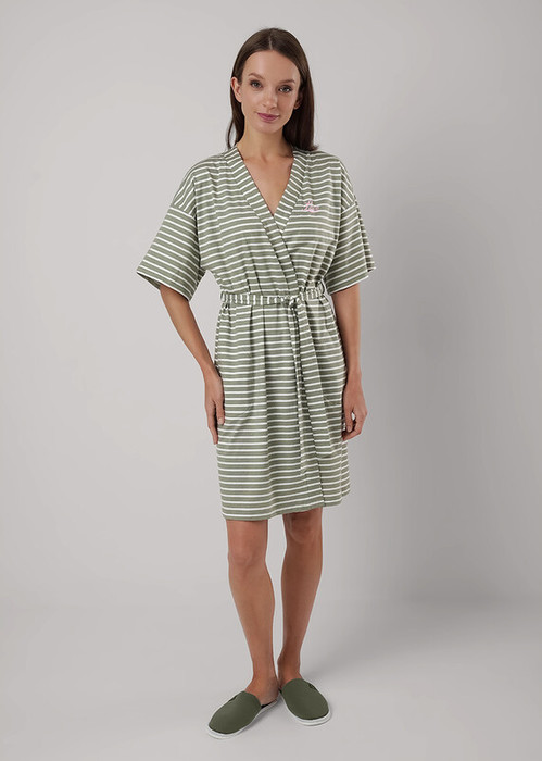 Халат женский для дома из хлопкового трикотажного полотна на запах. По борту обтачка. По талии съёмный пояс, внутренние завязки. Карманы в боковых швах. Спущенная линия плеча с рукавом длиной 3/4, нашивка.
