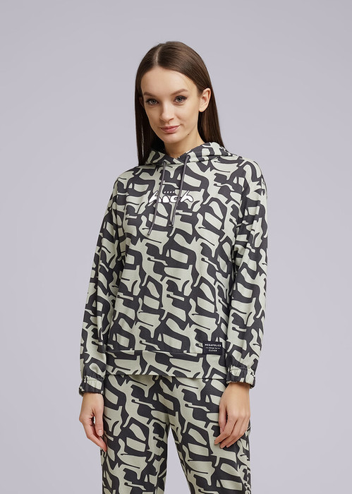 Толстовка для дома и отдыха свободного кроя из трикотажного полотна пике. Длинный рукав со спущенной линией плеча.По горловине капюшон со шнуром. По низу рукава манжет с внутренней резинкой, по низу изделия манжет, нашивка. Спереди принт.
