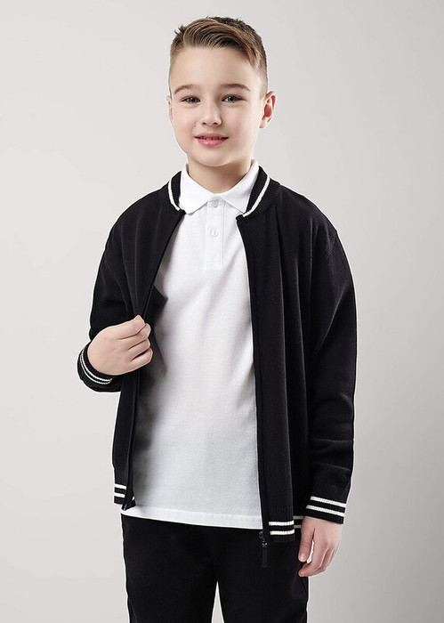 Базовый бомбер из хлопковой пряжи для мальчика. Застежка- молния, по низу рукавов и изделия эластичная вязка, украшенная декоративными полосками.