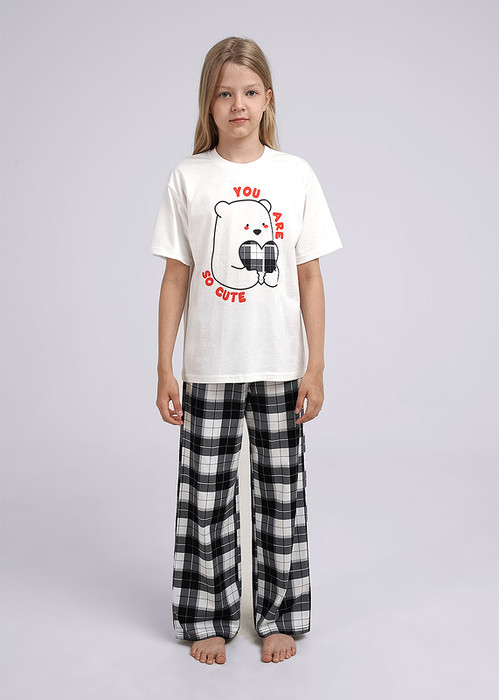 Вау! Стильная хлопковая пижама, как у мамы! Футболка среднего обьёма с милым принтом по переду. Широкие прямые брюки с трендовыми набивками. Резинка по поясу для комфортной посадки.