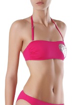 Костюм купальный женский однотонный из полиамида с эластаном. Лиф с прямоугольными чашечками на завязках вокруг шеи, с металлическим декором спереди. Трусы бикини на высокой посадке.