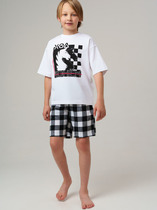 Новогодняя пижама для мальчика, состоящая из футболки и шорт. Стильная футболка свободного кроя дополнена оригинальным принтом. Шорты прямые средней длины с эластичным удобным поясом, выполнены из хлопкового полотна в клетку