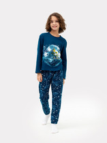 Комплект хлопковой пижамы из джемпера и брюк. Джемпер свободного кроя дополнен эластичной горловиной и манжетами. Брюки среднего объема, эластичный пояс обеспечит комфорт и идеальную посадку. По низу брюк эластичные манжеты.