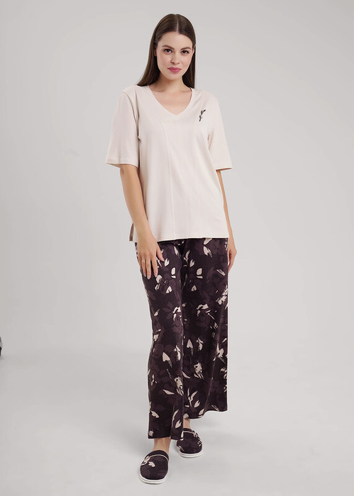 Набор одежды из трикотажного полотна с добавлением модала. Джемпер прямого кроя, втачной короткий рукав. Горловина с обтачкой. Спереди средний шов, рельефы,принт. Боковые разрезы. Брюки с поясом на резинке. Боковые карманы с отрезным бочком и кантом.