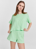 Пижама из трикотажного полотна кашкорсе с эластаном. Футболка прямого кроя, короткий втачной рукав, округлая горловина с обтачкой. Брюки прямые, пояс на внутренней резинке, нашивка бант. По низу футболки, рукавов и брюк мелкий оверлок.