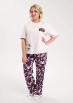 Набор одежды из трикотажного полотна.Футболка прямого кроя. Короткий втачной рукав с отворотом и закрепкой. По горловине обтачка.Спереди принт с помпоном, вшивка в боковом шве.Брюки с поясом на резинке.Боковые карманы с отрезным бочком.Внизу брюк манжет.