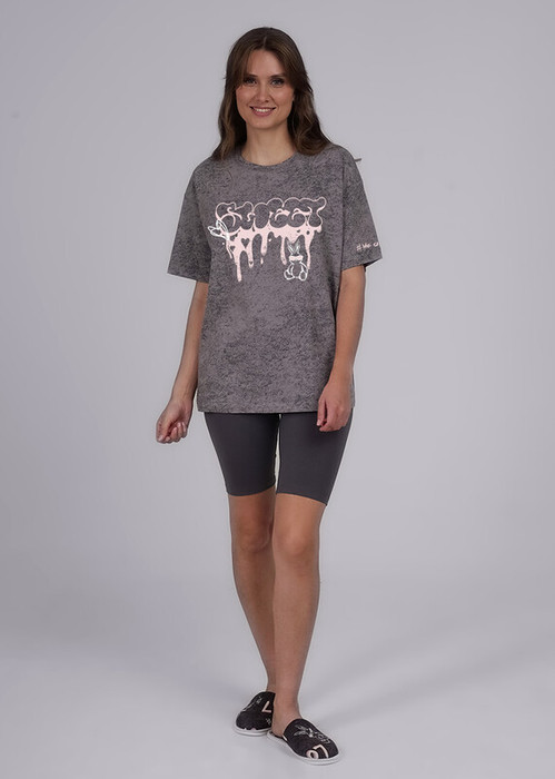 Пижама для дома. Футболка прямого силуэта из плотного трикотажного полотна. Округлая горловина с обтачкой. Короткий втачной рукав.На полочке и рукаве принт,внизу нашивка. Шорты из трикотажного полотна с добавлением эластана, с притачным поясом на резинке