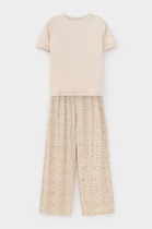 Пижама для дома из хлопкового трикотажного полотна.Футболка прямого кроя. Округлая горловина с обтачкой из кашкорсе. Короткий втачной рукав. На спинке внутренняя кокетка, застил. Шорты короткие,свободные. По талии притачная резинка жаккард, нашивка.