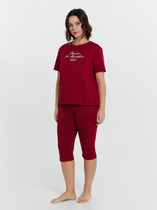Пижама для дома из хлопкового трикотажного полотна. Майка прямого силуэта, на узких бретелях. По горловине и пройме окантовка. Короткие шорты свободного кроя, цельнокроеный пояс на внутренней резинке.