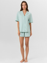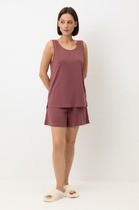 Пижама для дома и отдыха из вискозного трикотажного полотна кашкорсе лапша.Майка прилегающего силуэта. Спереди по горловине кружево, по спинке обтачка.По пройме узкая обтачка. Шорты по талии пояс на внутренней резинке. По низу майки и шорт узкий оверлок.