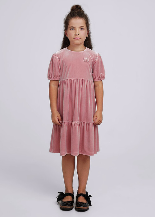 Новинка для самых нежных принцесс! Ярусное платье из мягкого велюра создано для милых нарядных образов. Свободная посадка, объемные короткие рукава, пышные ярусы - создают невероятно красивый силуэт. Спереди модель дополнена пришивным декором.