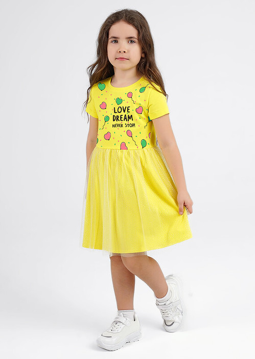 Желтое платье с ярким принтом превратит тебя в настоящую фею! Основа и подклад выполнены их эластичного хлопкового трикотажа, пышная юбка - из мягкой сетки. Такое платье отличный вариант для утренника или дня рождения.